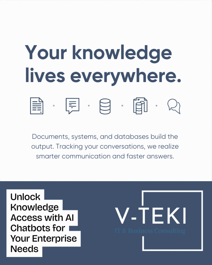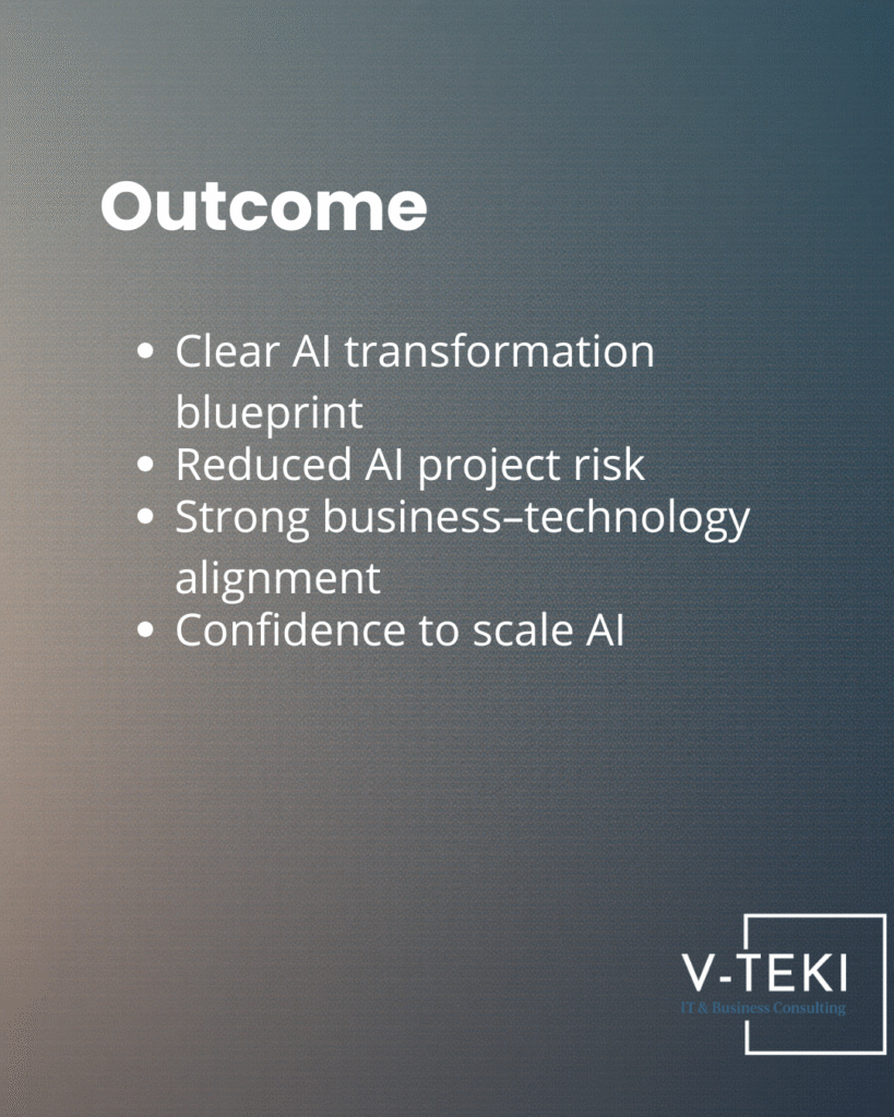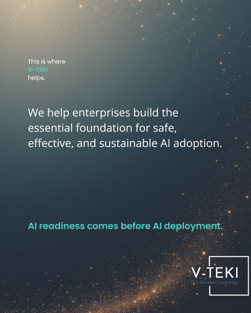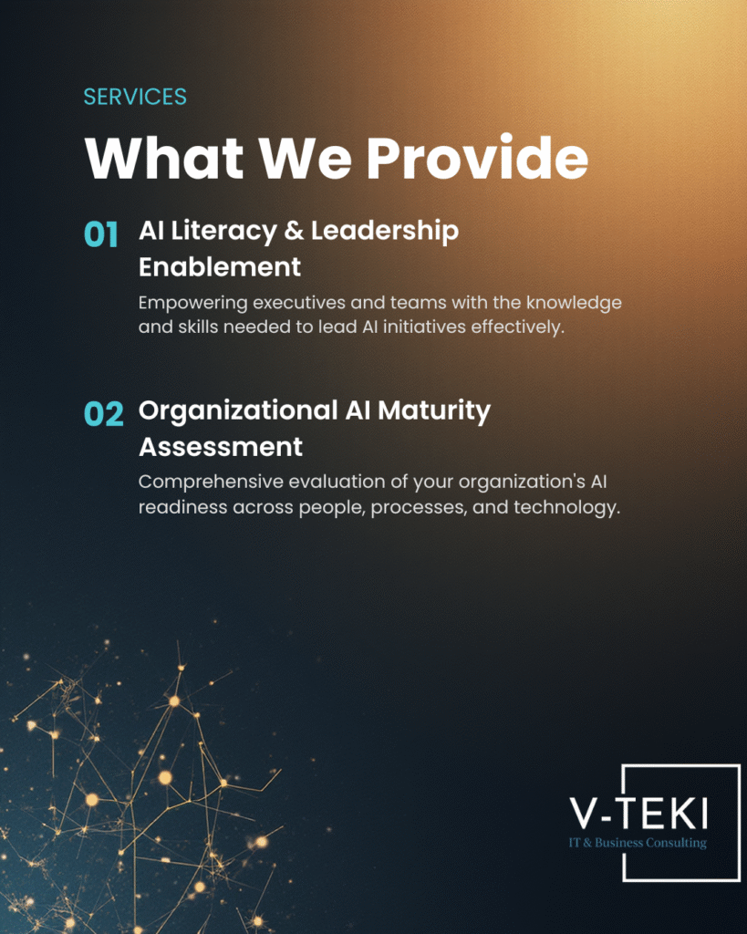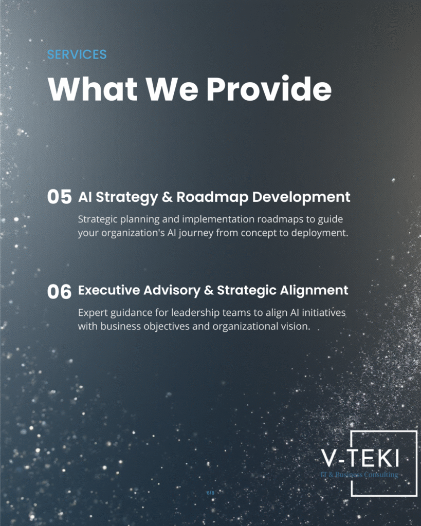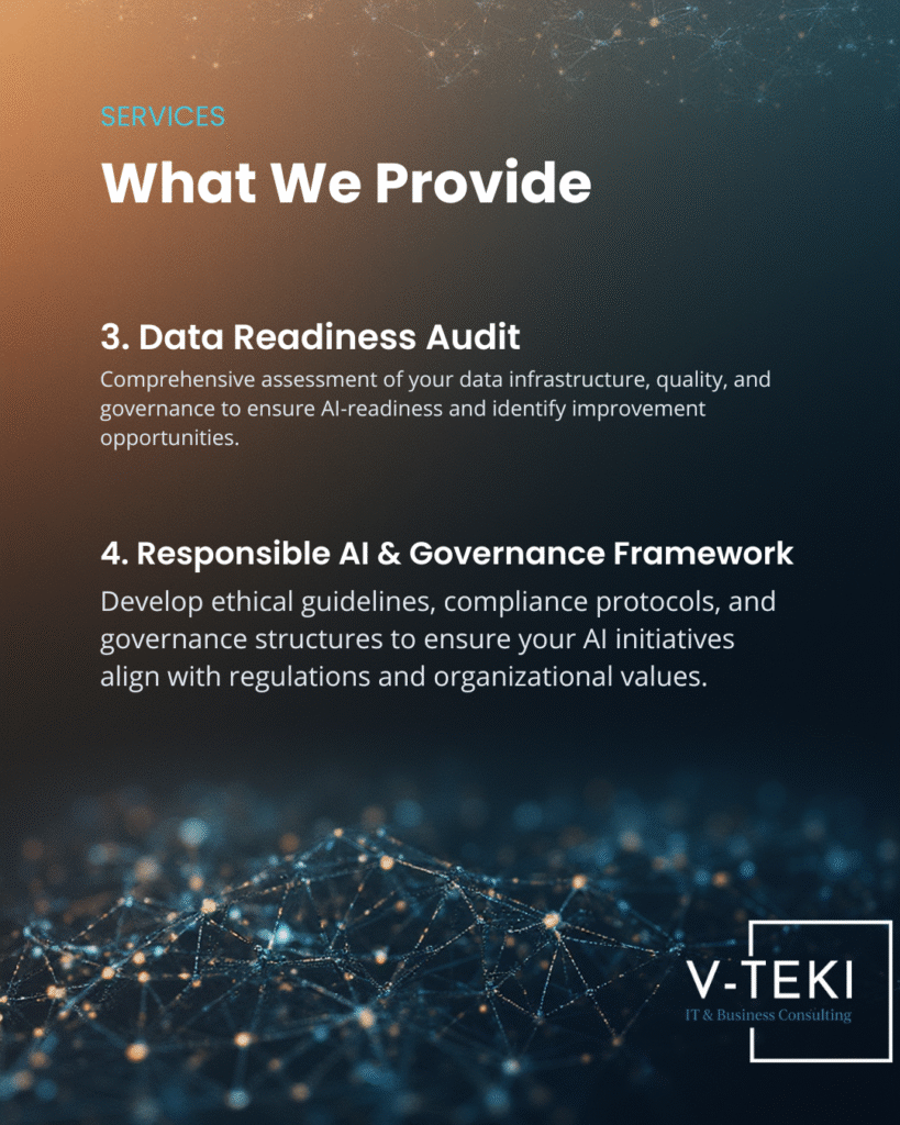 • At V-TEKI, we support enterprises through AI Consulting & Readiness Assessment, helping organizations build the essential foundations required for safe, effective, and sustainable AI adoption. Our work spans leadership enablement, AI maturity and data readiness assessments, responsible AI governance, and the development of actionable AI roadmaps aligned with business objectives.