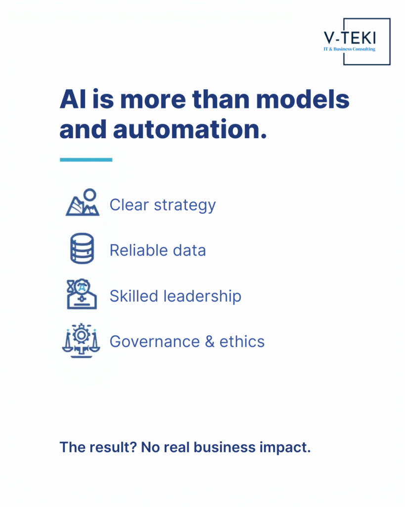 • We frequently see AI initiatives launched without a clear strategy, reliable data foundations, leadership alignment, or governance frameworks. This often leads to stalled pilots, low adoption, and limited measurable business impact.