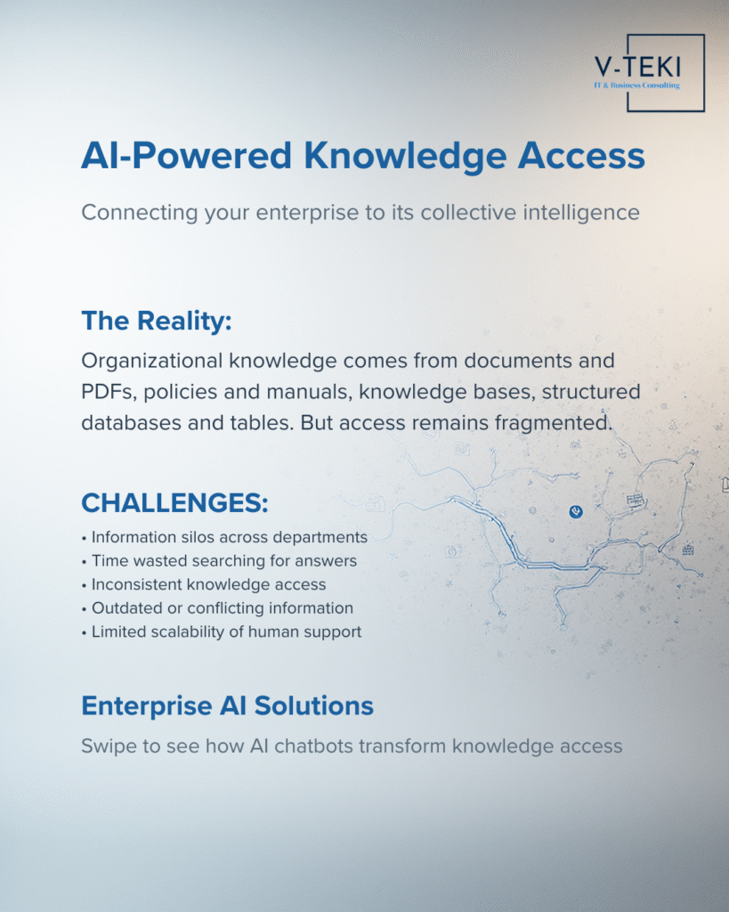 Organizational knowledge is distributed across documents, knowledge repositories, and structured databases.