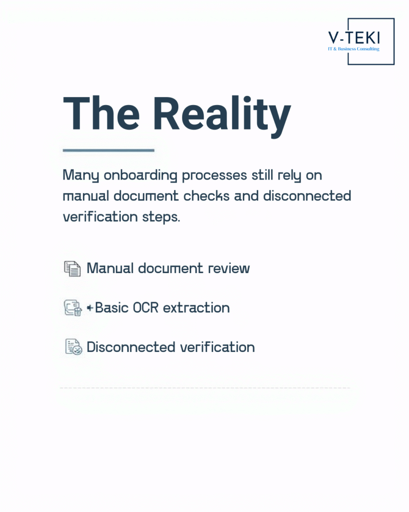 Many onboarding processes still depend on manual document review, basic OCR extraction, and fragmented verification workflows.